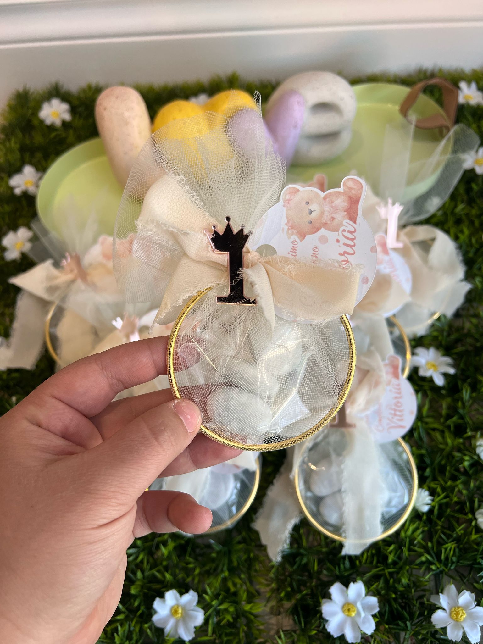 Mini bomboniera con 3 confetti , tag e numero in plexiglas abbinato