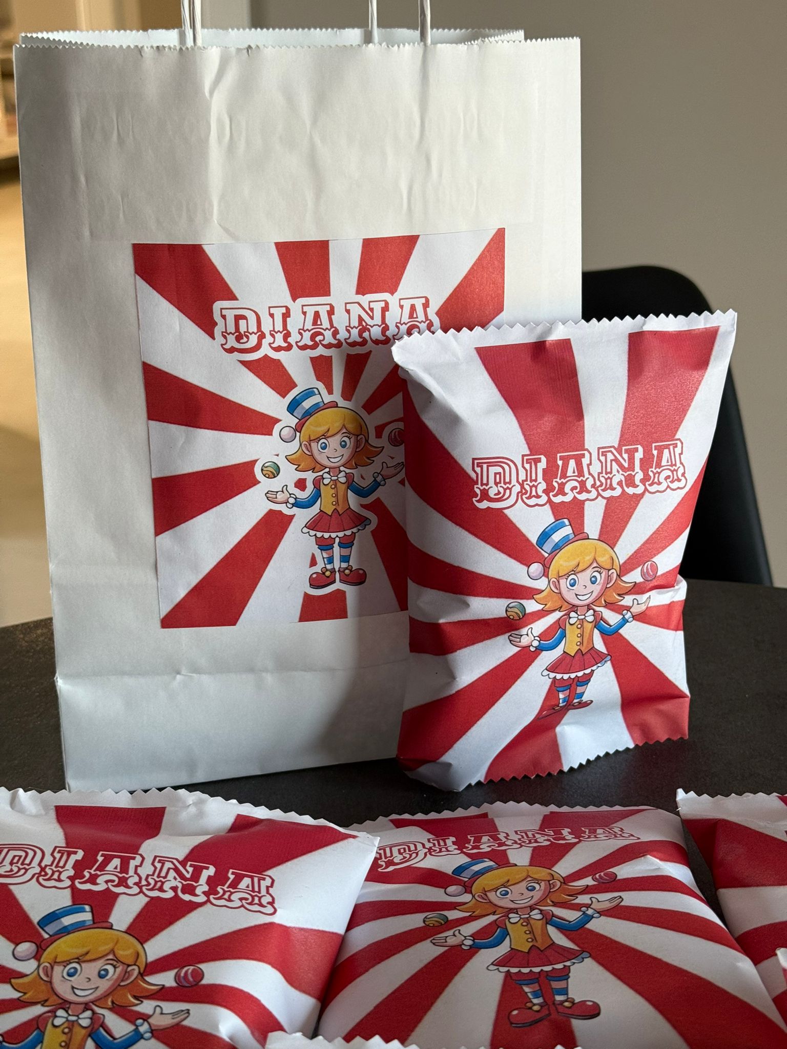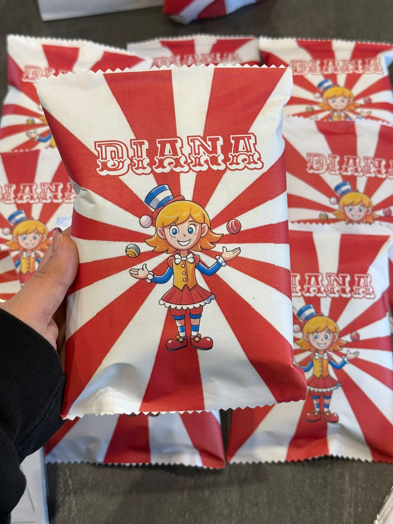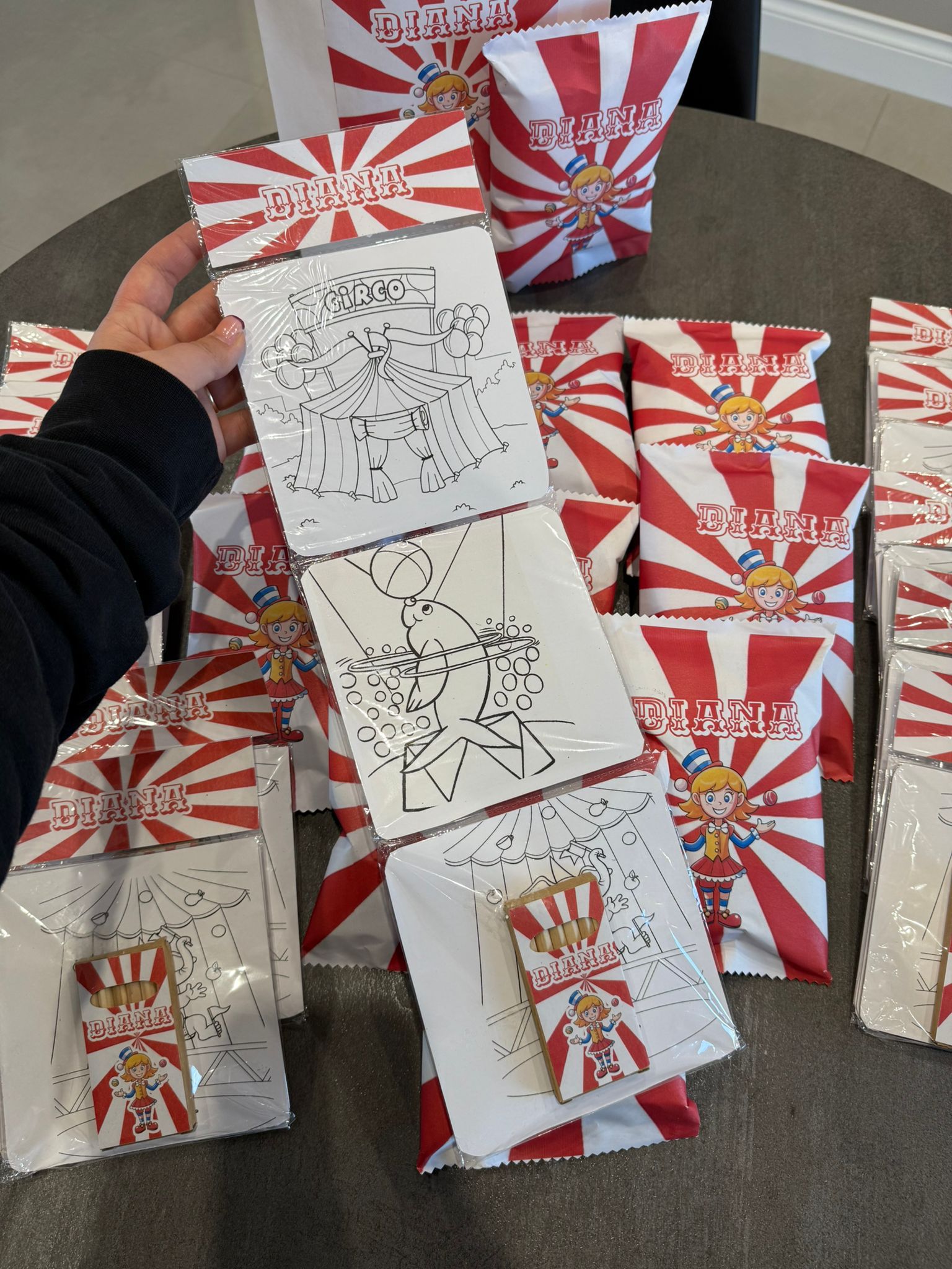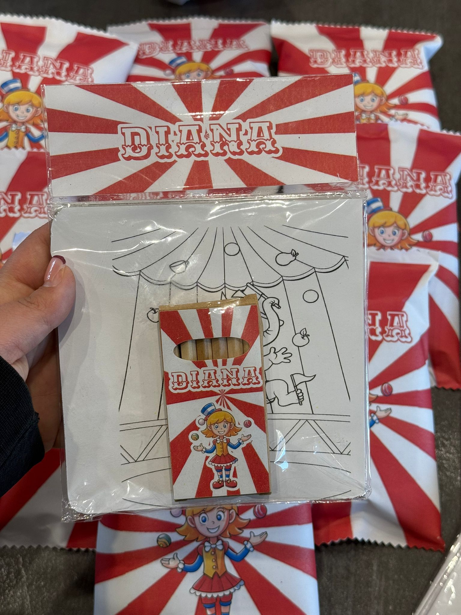 Un kit con tre cartoncini e sei matite colorate, tutto personalizzato